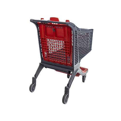 In addition, this trolley for large supermarkets incorporates a handle on the front for easy manoeuvrability in shop.